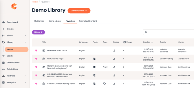 The Favorites tab gives you a consolidated view of all the Demos and Folders you’ve marked as Favorites in Consensus. Any Demo or Folder you have access to and have favorited will appear here, so you can quickly review them all in one place.