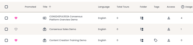- The first column from the Demo Table indicates whether a Demo or a Folder is a Favorite.