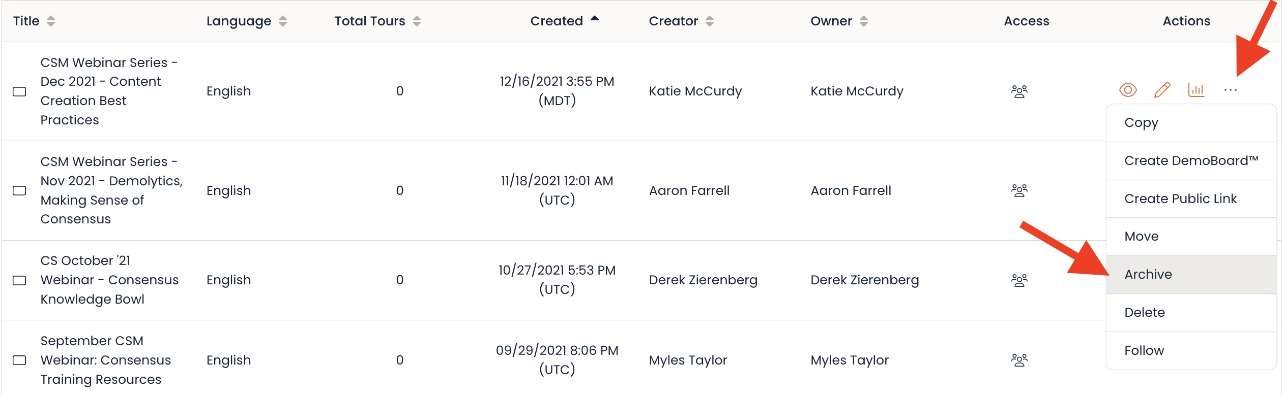 You have the ability to archive demos within Consensus. This can be done right inside of the Demo Library by selecting the "Archive" option within the additional actions: