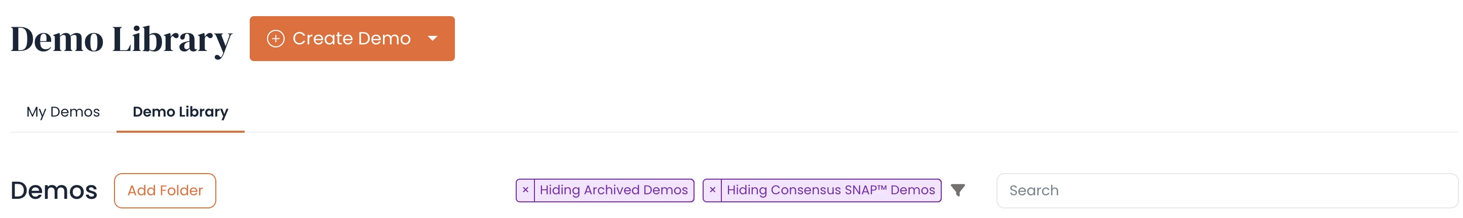 2. Remove the "Hiding Archived Demos' filter (in purple) at the top of the Demo Library by selecting the "x" to the left of the filter. By default, Consensus hides all archived demos from the Demo Library through this filter each time.