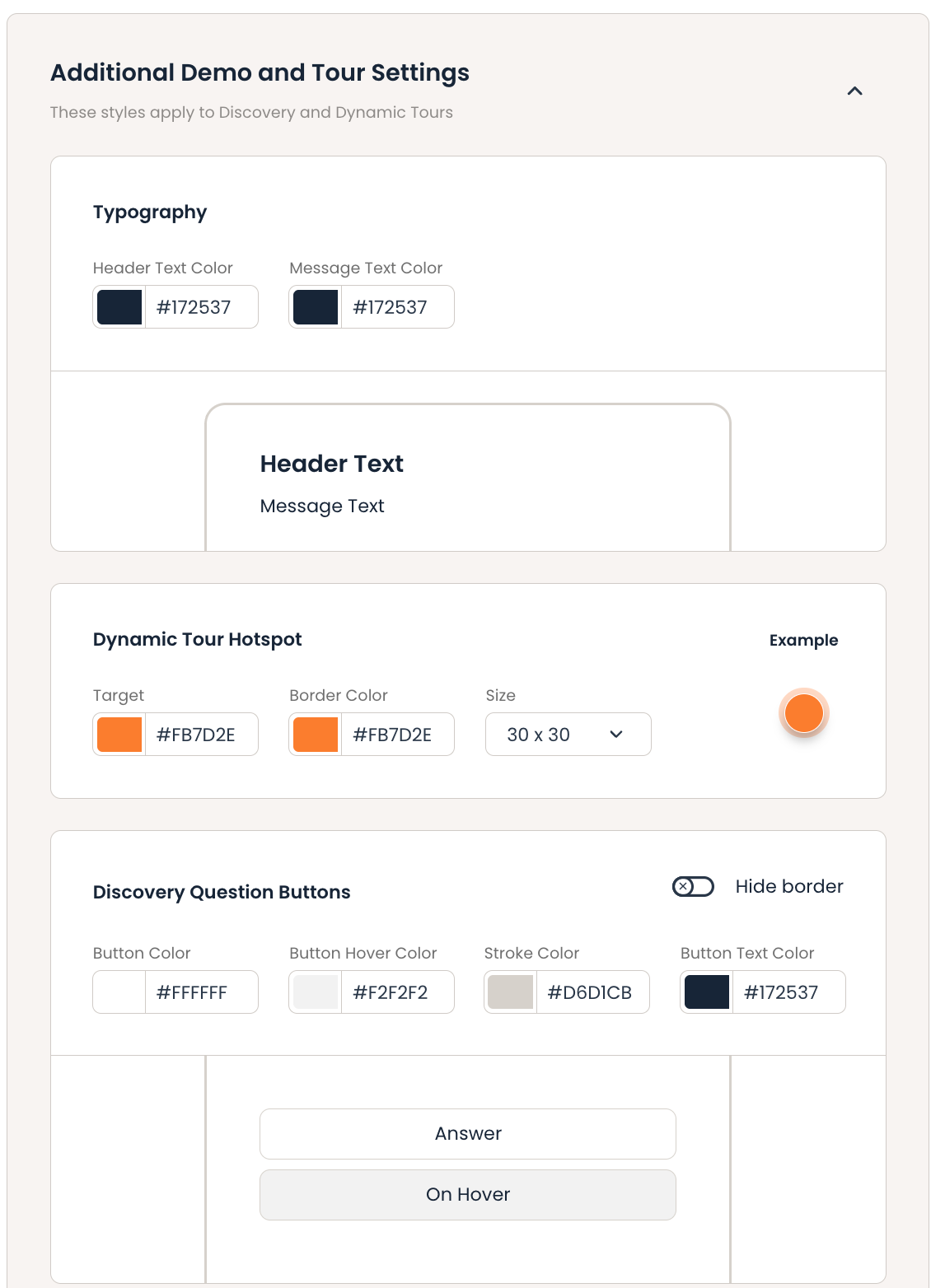 - Buttons, Tour popups, Targets & Interactive elements: configure the colors for your CTAs and popups.