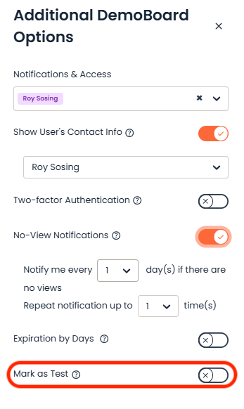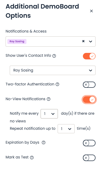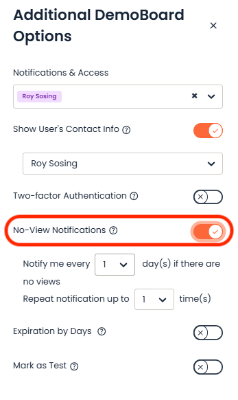 - No-view Notification: This feature allows you to set a cadence and the number of times you’d like us to notify you if nobody watches this DemoBoard. This is a great way to easily track which DemoBoards are not getting engagement, to know who to reach out to.