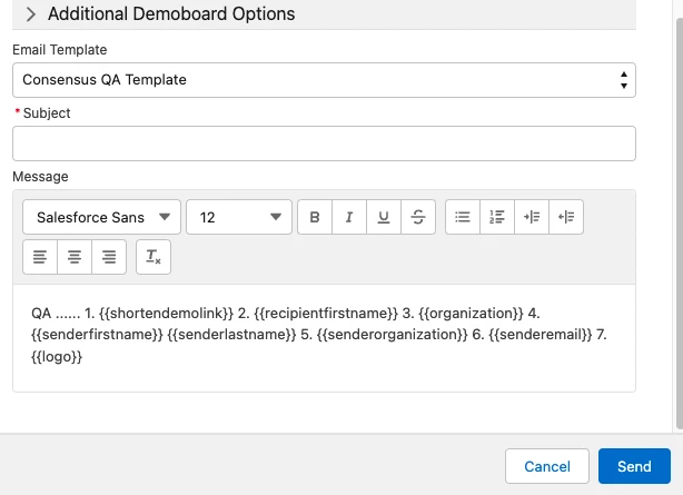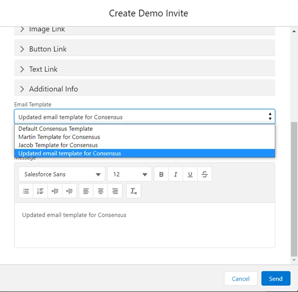 4) This allows the option to select custom email templates associated with Consensus when creating a Demo Invite within SFDC 9.1+.