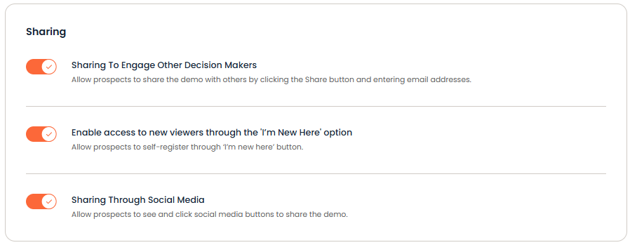 Sharing settings allow you to control Viewer features within your demos such as Sharing to additional Stakeholders or sharing the demo through Social media