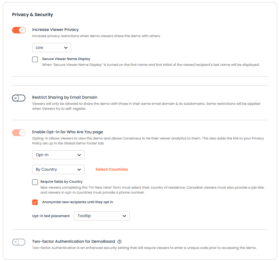 These settings allow you to control who can access your demos and what information they can see about others invited to a given DemoBoard. These settings allow you to protect both the privacy of your viewers and the content of your Demos.