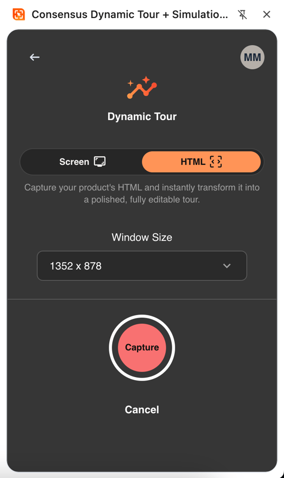 Open the Consensus Chrome extension and select Dynamic Tour. In the capture menu, choose HTML (rather than Screen) as your capture type.