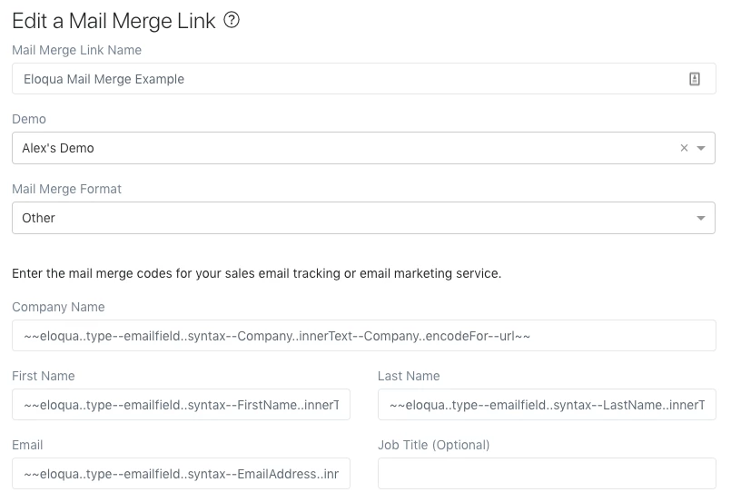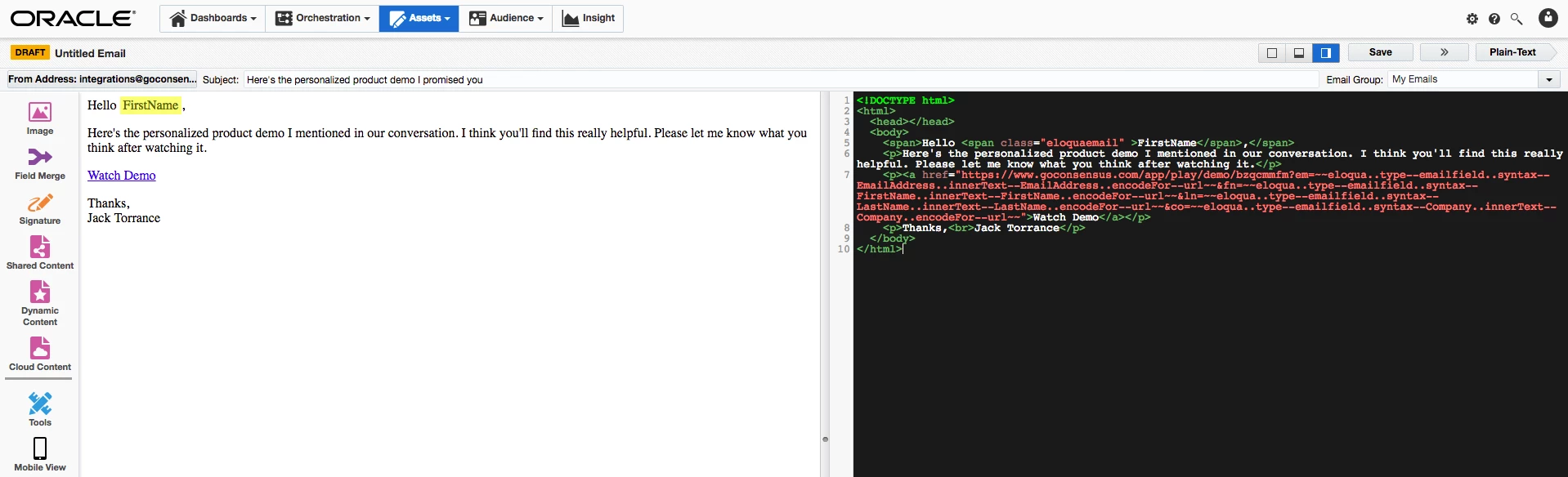 Good job!! You now should have an email template with the mail merge demo link setup in Eloqua.