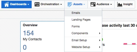 1. Log in to your Eloqua instance and go to Assets and in the dropdown menu select Emails