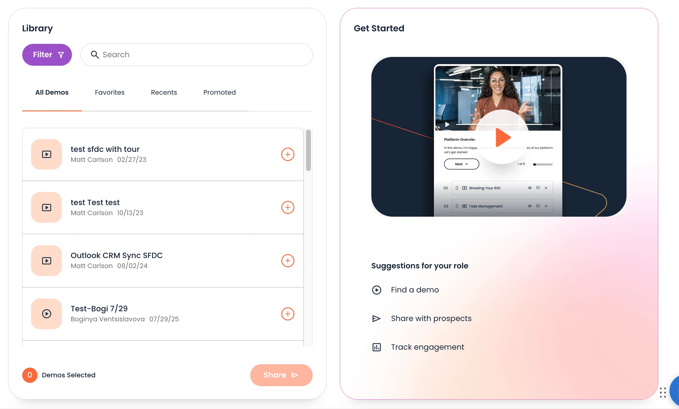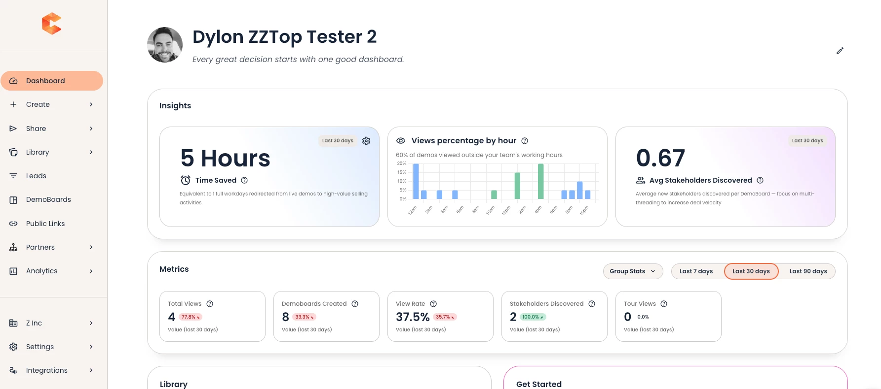 The Consensus Dashboard is your new homepage experience, providing immediate visibility into demoboard performance, content engagement, and key activities like sharing new content. Instead of landing on a static page with our onboarding video, you'll now see key metrics and have quick access to your demo library to share content every time you log in.