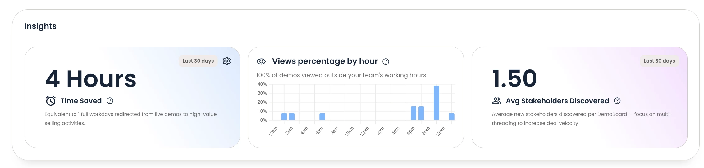 Stakeholders Discovered: This measures buying group expansion - how many new people are being introduced to your demos through sharing. Growing stakeholder discovery means you're effectively multi-threading within accounts.