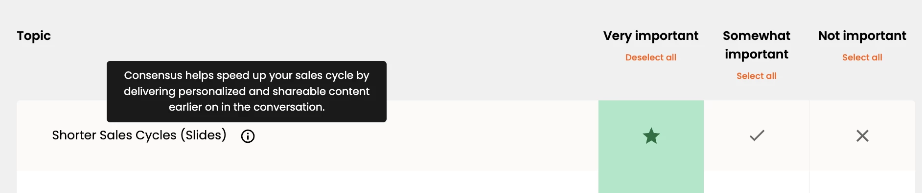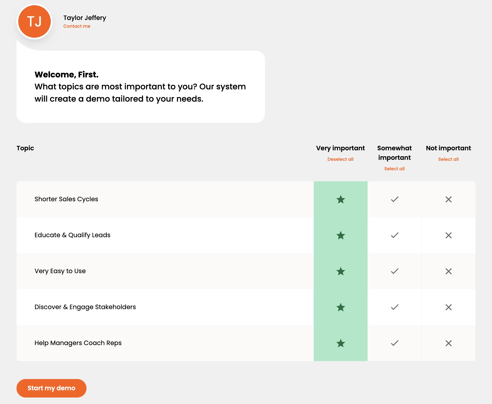 Your feature titles are what viewers will be selecting from within the personalization stage. These feature titles are added during Stage 3: Demo Content within the Demo Wizard as a required field. These features or topics are what drive your key demolytics and help to determine what areas of your product are most important to each individual viewer.