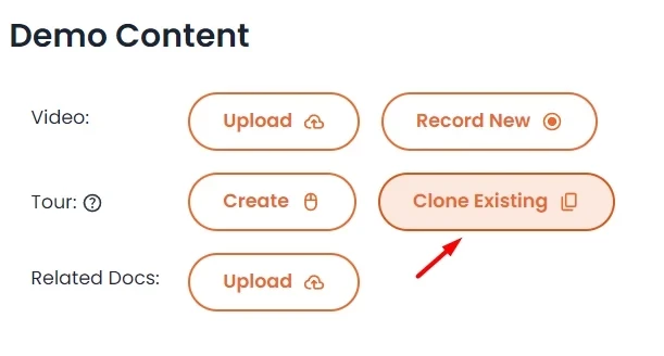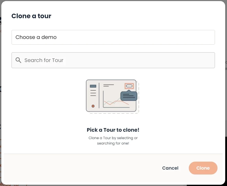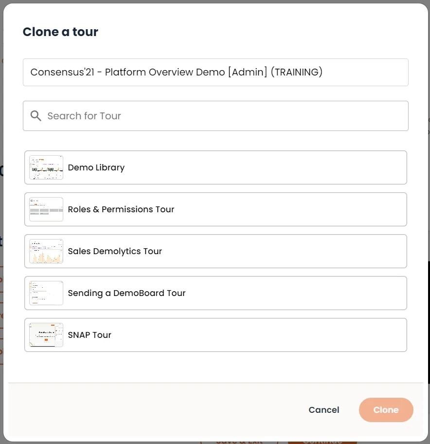 Clone Existing TourOnce you select clone existing, there will be a pop-up for you to select the Tour within the specific demo to be cloned. Note that selecting at least a demo is required in this step.