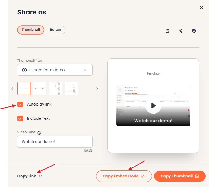 To enable autoplay, navigate to the Public Links > Create Public Link. You'll select the demo you want to use and click "Copy Link" or “Copy Embed Code”.