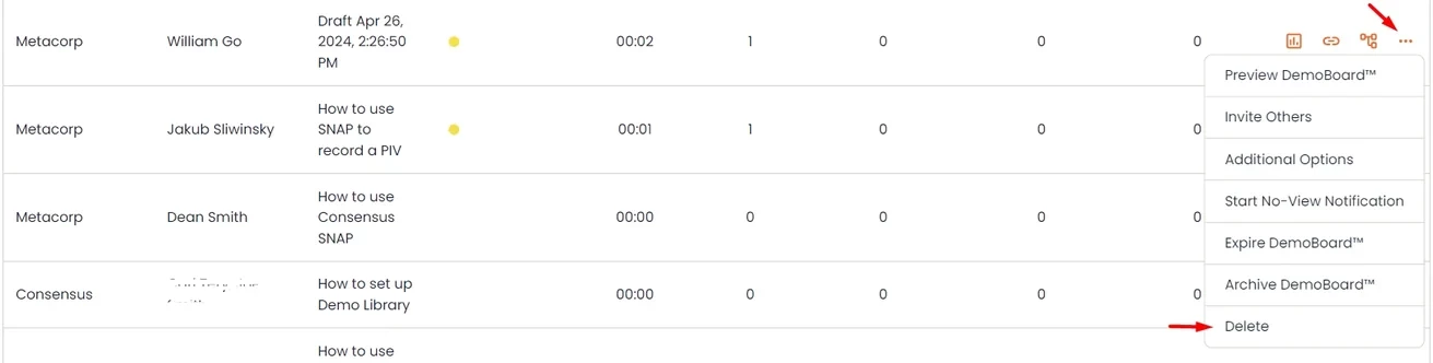 You may also want to delete a DemoBoard because a prospect asks you to delete their data for the purposes of privacy (e.g. you send a DemoBoard and a prospect responds with, "Hey, I don't want my personal information in there, please delete that.") related to GDPR (General Data Protection Regulations) in the EU.