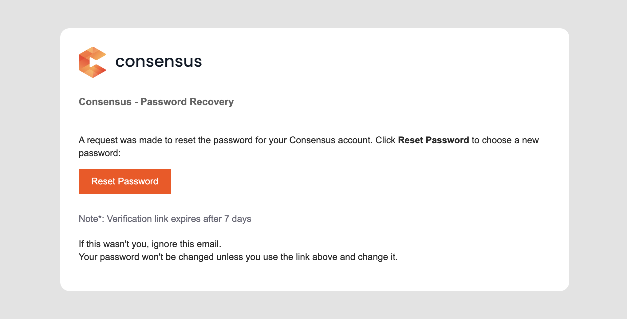 - You'll receive a password recovery email for you to set a new password for your Consensus account. Once you have set a new password, you should be able to use it to log in to your account.