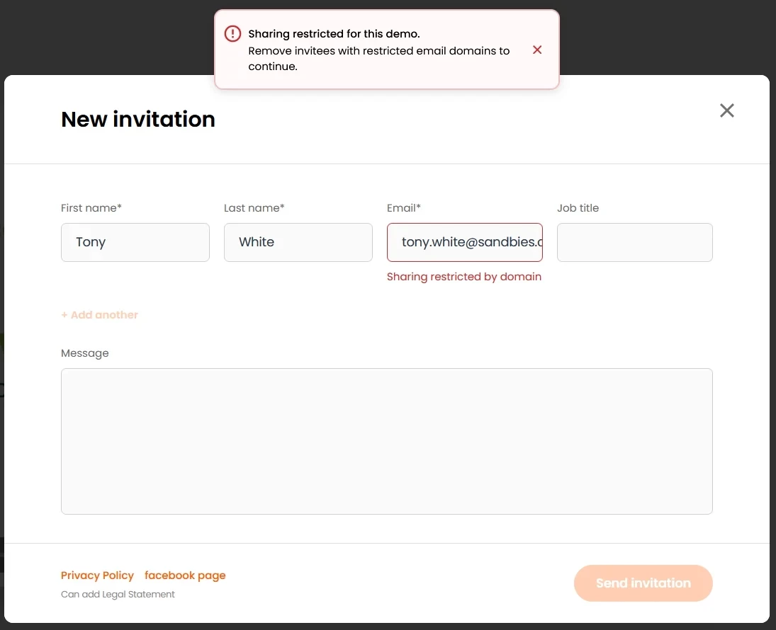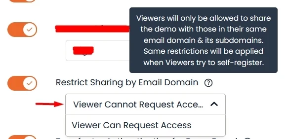 This will prevent them from sharing the demo with anyone who doesn't have the same email domain suffix that they have. For example, if you send the demo to john.doe@acme.com, they can share the demo with anyone who has an email that ends in "acme.com", but they cannot share it with anyone who has a different email suffix.