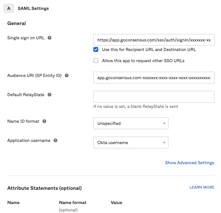 Single sign on URL - Paste in the "Single Sign On URL" from Consensus.