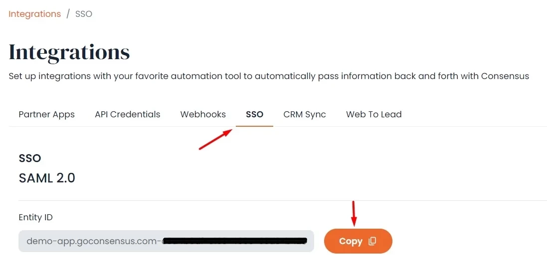 Log in to Consensus as an admin. Then go to Integrations > SSO. If you do not see SSO as a tab, contact your CSM.