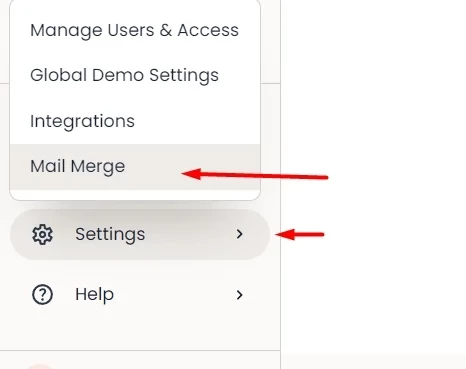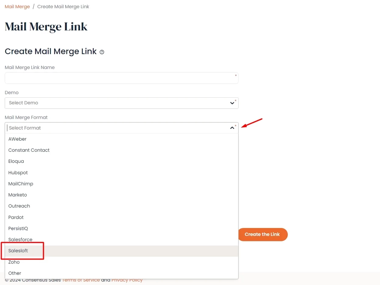 1. From the Consensus main page navigate to the Settings icon on the bottom left corner and select Mail Merge. Create a new mail merge demo link using the Salesloft Format: