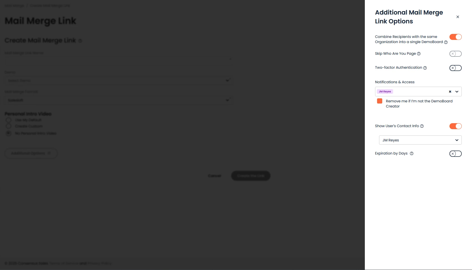 2. Additional options will allow users to determine if recipients from the same organization should be included on the same DemoBoard link (recommended to leave this turned on). Additional notifiers will also be able to be added here, just like a regular DemoBoard link created singularly. Adding users in the Notifications & Access section will allow them to be notified when a recipient watches and/or shares a demo.