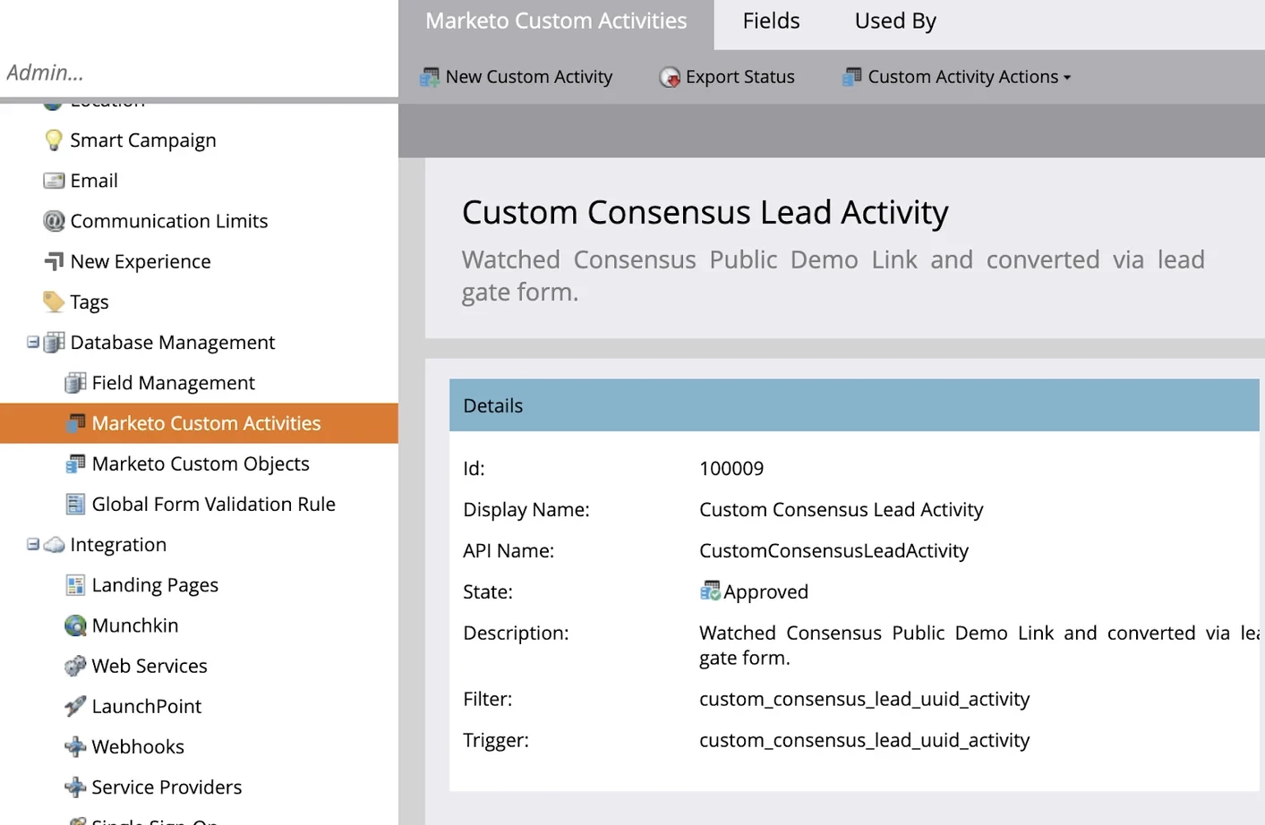 *IMPORTANT NOTE* - Please DO NOT create a custom activity by yourself. The integration creates this automatically for you. Also, please make sure you have enough Custom Activities available within your Marketo account. There is typically a limit of 10 out of the box, so you may need to work with Marketo to enable additional custom activities.