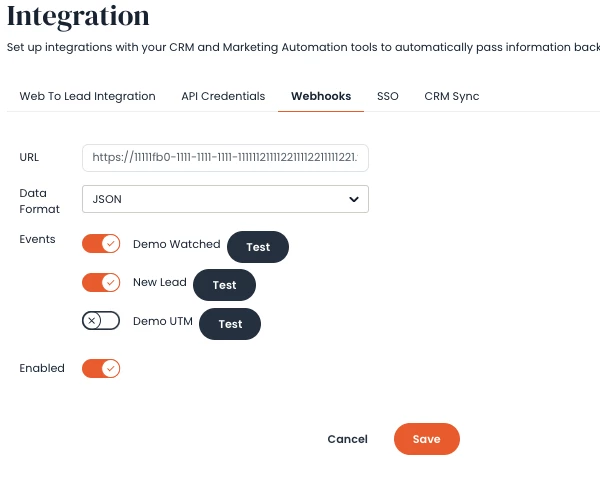 Step 5: Create a new webhook in Consensus, and enable it for the "New leads" and "demo watch" events