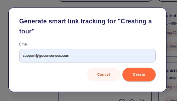 From here the user enters in the email address they would like tied to this link for tracking purposes and clicks “Create”. The analytics on this experience will show on our “Smart Link Tracking Experience” tab in Analytics but will also be added to the contact’s activity in a CRM if an integration is connected